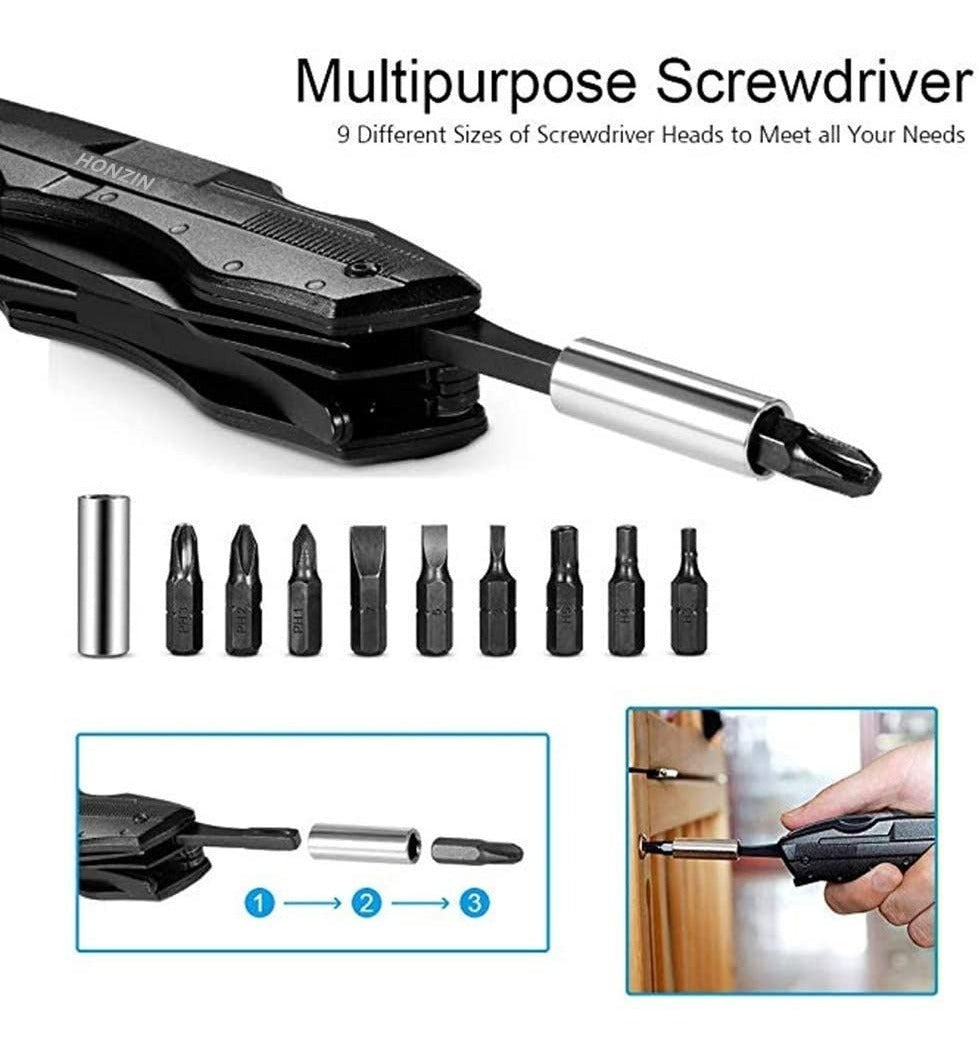 Con 16 funciones desde alicates a destornilladores, alicates regulares, cortadores de alambre, cuchillas, destornilladores Phillips, etc. Utilice estos alicates multitool para reparar y reparar casi cualquier hogar y es ideal para sobrevivir